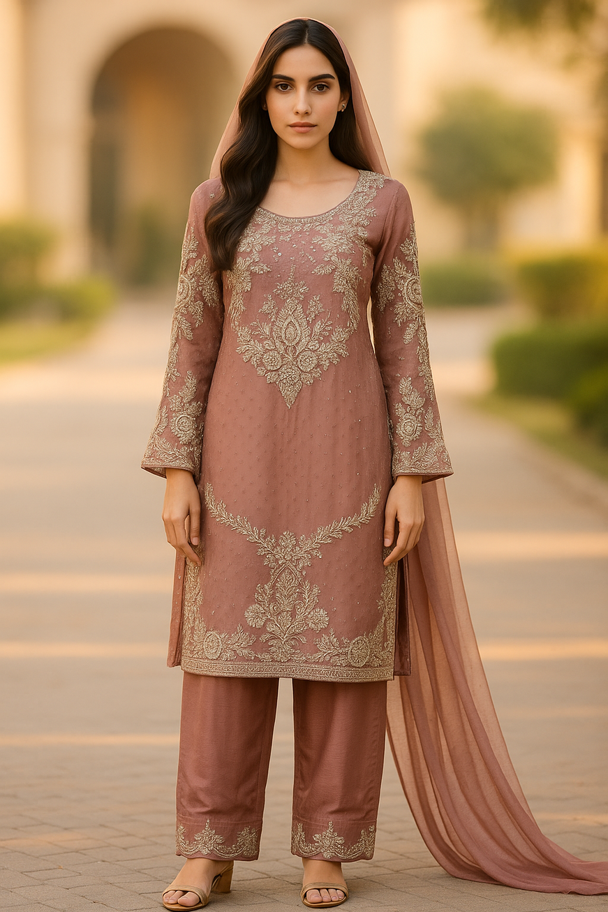 A bloom of elegance, wrapped in soft hues and delicate charm. Rose is a timeless expression of grace — perfect for the woman who walks with poise and carries love in every step. With gentle embroidery that whispers tradition and fabric that flows like petals in the breeze, this piece captures the essence of romance and refinement.